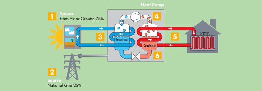 Heat pumps use conventional refrigeration technology to extract the suns energy stored in the environment and raise it to a temperature suitable for heating and hot water purposes.